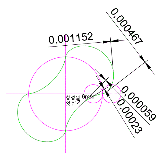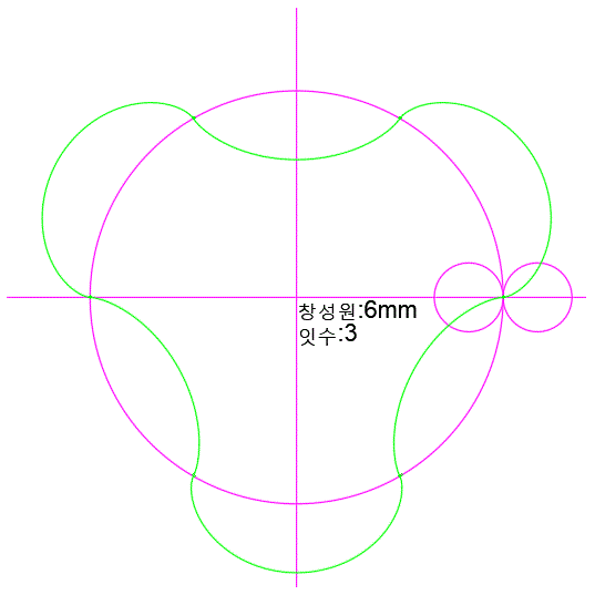 Cycloid:E6H6Z2를 입력하고 기어가 그려질 위치에 마우스를 클릭하면 창성원 지름 6이고 잇수가 2인 사이클로이드 기어를 그립니다.