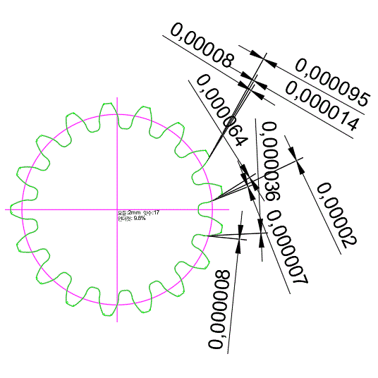 * 오차: 기어가 그려진 치형은 호로 구성 되어 있으며 호와 호가 만나는 점은 정확한 치형 위의 점입니다. 곡선 수와 관련이 있는 S값을 많게 하여 겹쳐서 기어를 그리면 오차를 볼 수 있습니다. 아래는 기본 값인 S20과 S100을 겹쳐서 그려서 오차의 정도를 표기한 그림입니다.
