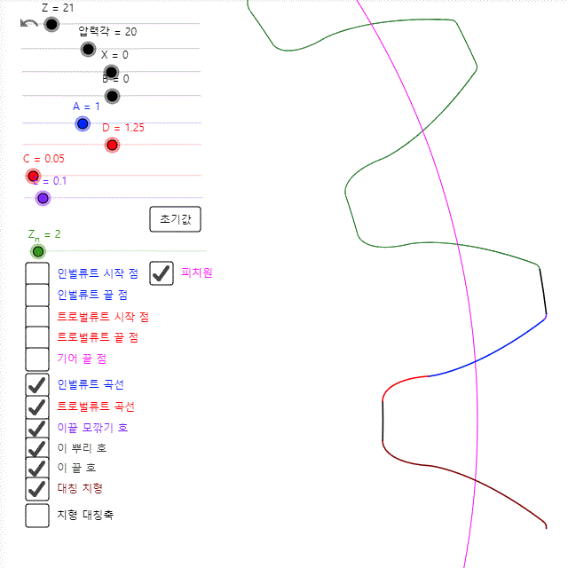 인벌류트 치형을 형성하는 압력각, 전위, 백래쉬 등의 값들의 변화에 따라 기어 모양이 어떻게 변하는지를 지오지브라 프로그램을 통해 한눈에 확인할 수 있습니다.